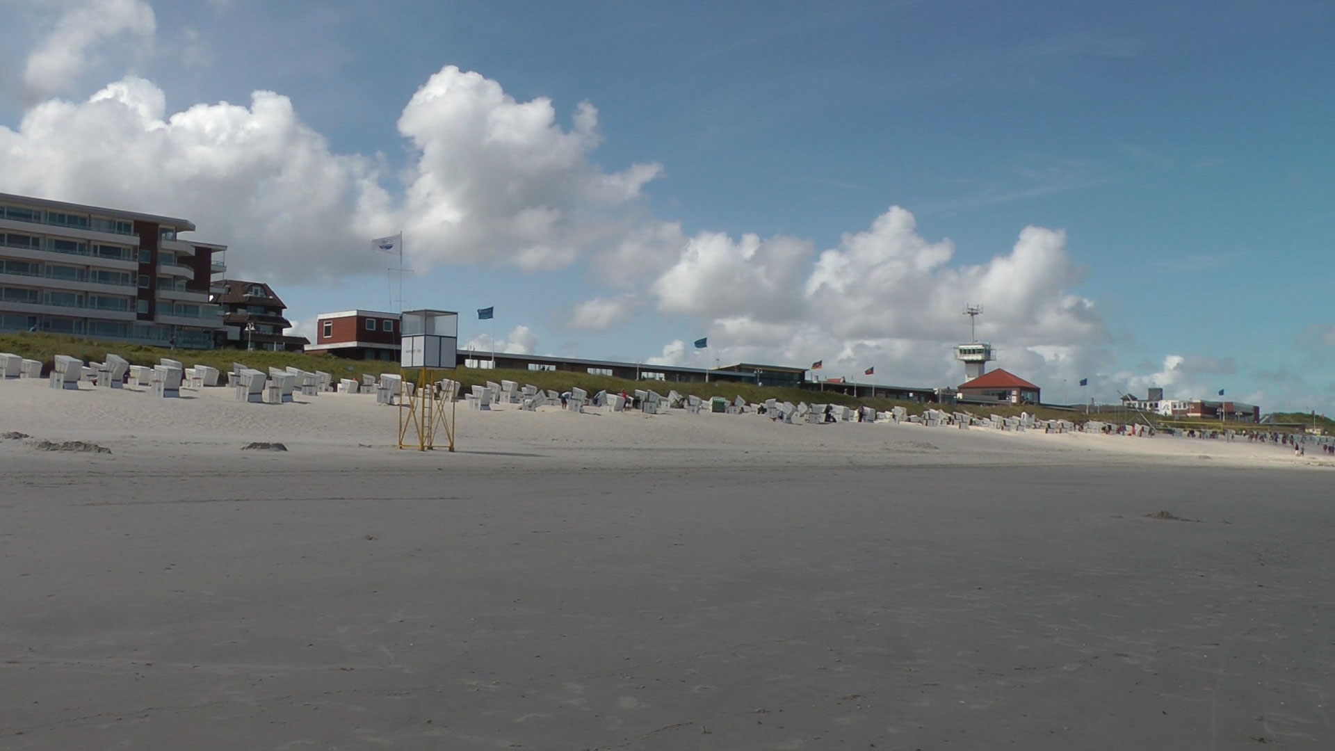 Von der Bahn aus können wir direkt den Westturm sehen. Es handelt sich hierbei um einen Signalturm, der 1932/1933 errichtet wurde. Er dient heute als Wahrzeichen und Wappensymbol der Wangerooges. Der Vorgänger, der genauso aussah wurde zwischen 1597 und 1601 erbaut aber leider am 24.12.1914 gesprengt, da man der Meinung war, das der Turm feindlichen Schiffen als Orientierung dienen könnte.